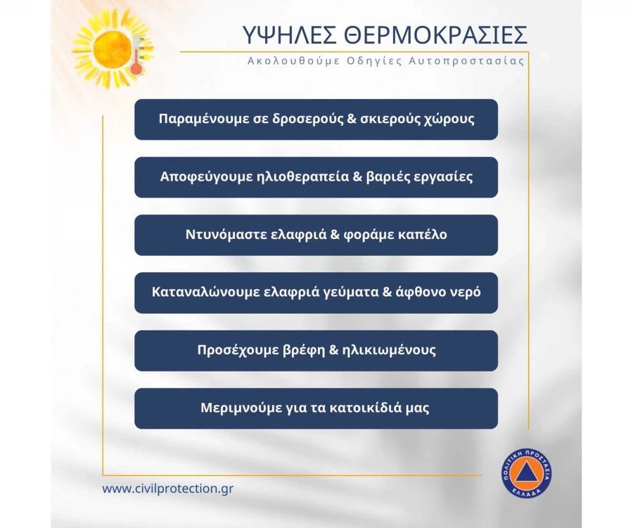 Επιπλέον η Γενική Γραμματεία Πολιτικής Προστασίας έχει θέσει τον κρατικό μηχανισμό σε αυξημένη ετοιμότητα και συνιστά στους πολίτες να λαμβάνουν μέτρα αυτοπροστασίας. Οι οδηγίες περιλαμβάνουν παραμονή σε δροσερούς χώρους, αποφυγή ηλιοθεραπείας και βαριάς σωματικής εργασίας, κατανάλωση ελαφρών γευμάτων και άφθονων υγρών, καθώς και ιδιαίτερη μέριμνα για βρέφη, παιδιά, ηλικιωμένους και άτομα με χρόνια νοσήματα. Το Πυροσβεστικό Σώμα, οι Ένοπλες Δυνάμεις, η ΕΛΑΣ, το ΛΣ, και άλλοι φορείς βρίσκονται σε επιφυλακή για την άμεση αντιμετώπιση των επιπτώσεων του καύσωνα.