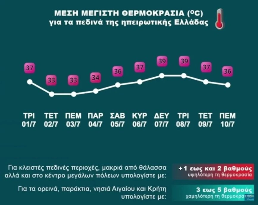 Ωστόσο, σε κλειστές πεδινές ζώνες μακριά από τη θάλασσα, καθώς και σε μεγάλα αστικά κέντρα όπως η Αθήνα, η Λάρισα και η Θεσσαλονίκη, το θερμόμετρο ενδέχεται να δείξει ακόμα και 40°C ή 41°C.