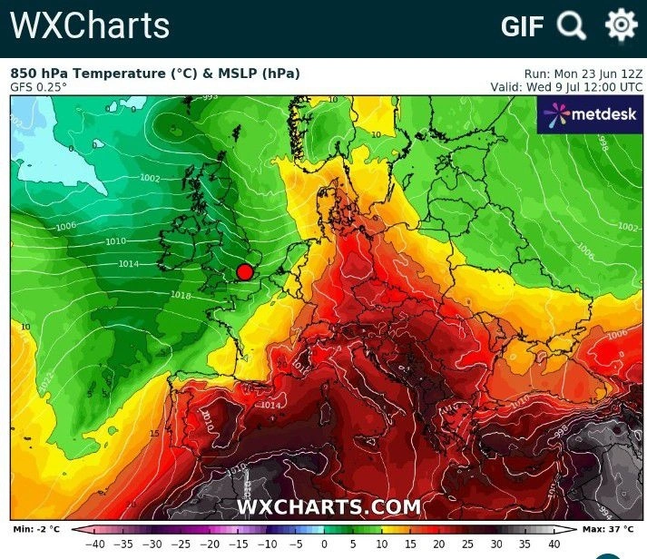 Σύμφωνα με τους χάρτες θερμοκρασιών στα 850 hPa (περίπου 1.500 μέτρα υψόμετρο), η Ελλάδα θα βρεθεί μέσα στον θερμό πυρήνα μιας εκτεταμένης αέριας μάζας που θα καλύψει μεγάλο μέρος της Νότιας και Κεντρικής Ευρώπης. Οι θερμοκρασίες σε αυτό το υψόμετρο αναμένεται να κυμανθούν μεταξύ +26 και +28 βαθμών Κελσίου, τιμές που, σε συνθήκες ηλιοφάνειας, μεταφράζονται σε θερμοκρασίες στην επιφάνεια του εδάφους άνω των 42–43 βαθμών.