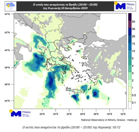 Στους χάρτες που ακολουθούν παρουσιάζεται ο υετός που αναμένεται το βράδυ (20:00 – 23:00) της Κυριακής 10/12 και κατά τις πρώτες ώρες (02:00-05:00) της Δευτέρας 11/12.