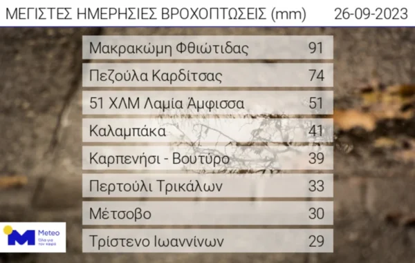 Σύμφωνα με τις καταγραφές του δικτύου αυτόματων μετεωρολογικών σταθμών του meteo.gr/ΕAA, μέχρι τις 19:45, το μεγαλύτερο ύψος βροχής καταγράφεται στη Μακρακώμη Φθιώτιδας και είναι ίσο με 91 χιλιοστά. Στον πίνακα που ακολουθεί παρουσιάζονται τα 8 μεγαλύτερα ύψη βροχόπτωσης.