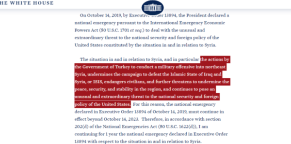 Ο Λευκός Οίκος επεκτείνει την εθνική επείγουσα κατάσταση αναφορικά με την Συρία, κατονομάζοντας σαφώς την τουρκική στρατιωτική επίθεση στα βορειοανατολικά της χώρας ως εξέχουσα απειλή για την εθνική ασφάλεια και τον αγώνα κατά του Ισλαμικού Κράτους. Η επεἰγουσα κατἀσταση κηρύχθηκε το 2019 και θα συνεχιστεί για ένα ακόμη έτος.