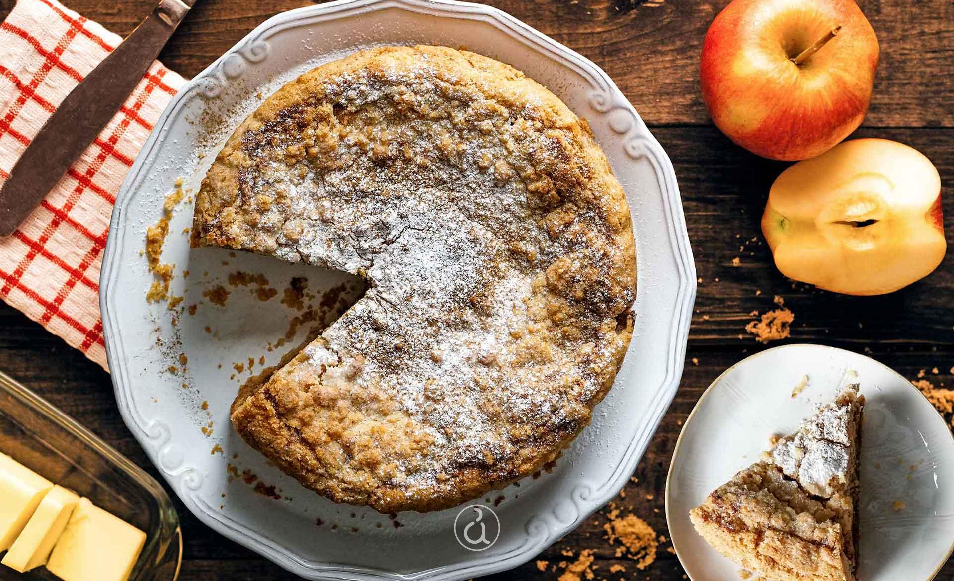 Μετά, πασπαλίζουμε την υπόλοιπη τριφτή ζύμη από πάνω, χωρίς να πιούμε τα κομμάτια, ώστε να δημιουργηθεί μια χοντρή υφή στην επιφάνεια.