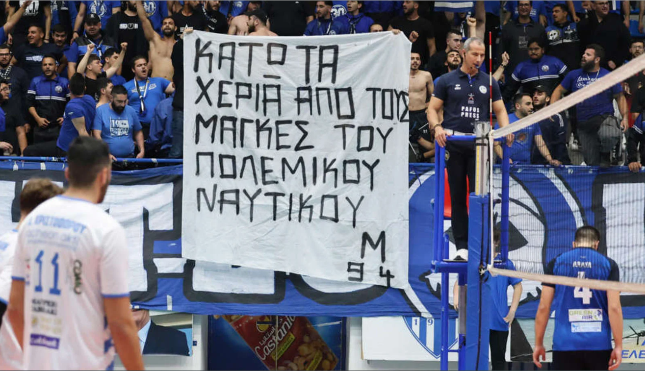 Το μήνυμα του πανό, “Κάτω τα χέρια από τους μάγκες του Πολεμικού Ναυτικού!”, εκφράζει την αλληλεγγύη προς τους δόκιμους υπαξιωματικούς και αποτελεί μια σαφή απάντηση σε όσους επέκριναν το σύνθημά τους.