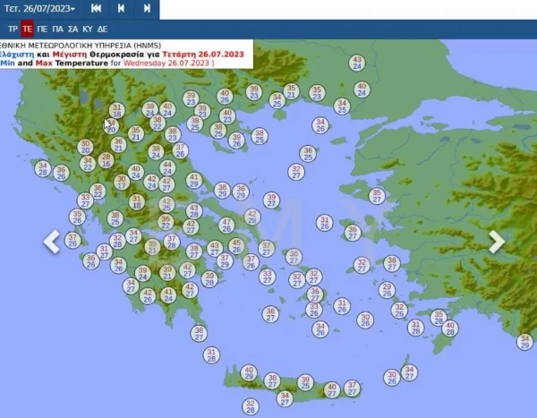 Θερμοκρασία: Από 26 έως 43 με 44 βαθμούς Κελσίου. Στα παραθαλάσσια η μέγιστη θα είναι 2 με 3 βαθμούς χαμηλότερη.