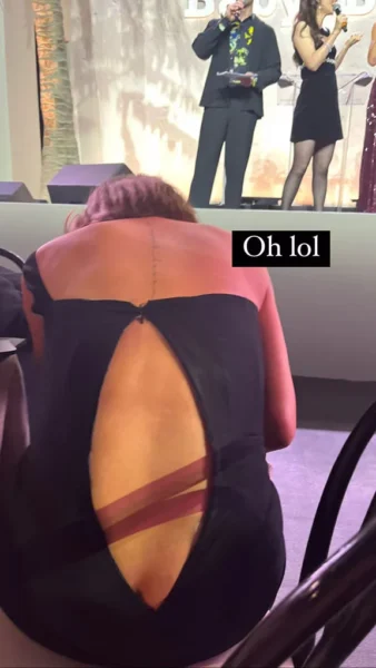 Η φωτογραφία που μοιράστηκε στα Instagram Stories της την έδειχνε να κάθεται σε μια καρέκλα… Με ένα μεγάλο κενό από το σκίσιμο του φερμουάρ στο πίσω μέρος του φορέματος. Η Τέιγκεν είναι σκυμμένη στη φωτογραφία, πιθανότατα γελώντας με το απροσδόκητο «ατύχημα».