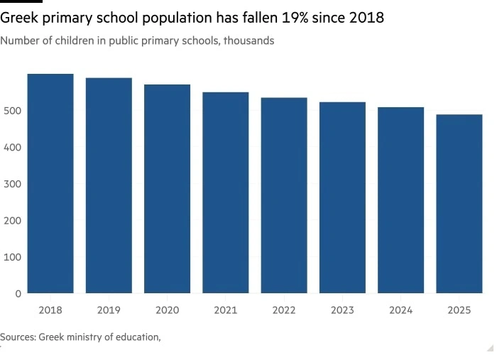 Σύμφωνα με ρεπορτάζ των Financial Times, το φαινόμενο δεν περιορίζεται πλέον σε απομακρυσμένα χωριά και νησιά. Αλλά πλήττει ακόμη και περιοχές της Αττικής. «Οι αίθουσες διδασκαλίας αντικατοπτρίζουν την κατάσταση των μαιευτηρίων μας και τον αριθμό των γεννήσεων», δήλωσε η υπουργός Παιδείας Σοφία Ζαχαράκη, επισημαίνοντας τη δραματική μείωση των παιδιών που φοιτούν στα σχολεία.