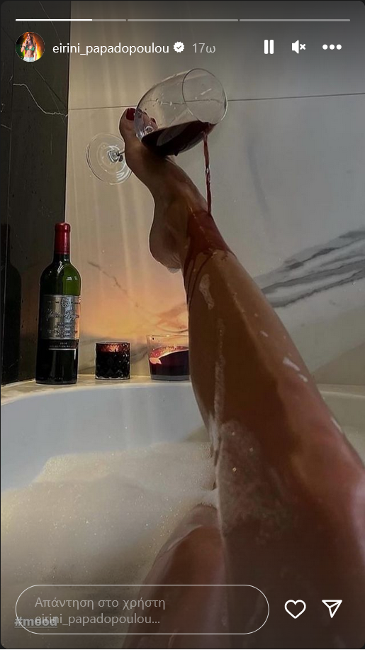 Η Ειρήνη, που αποφάσισε να μη συμμετάσχει στο Survivor λόγω απροόπτου, ετοιμάζεται για τις γιορτές και μας κρατάει ενήμερους σε κάθε βήμα της. Ακόμα και για το χαλαρωτικό της μπάνιο, ενώ απολαμβάνει ένα ποτήρι κρασί. Ή κάτι αντίστοιχο…
