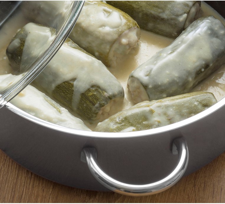 Έπειτα ρίξτε το αυγολέμονο πάνω από τα γεμιστά κολοκύθια και αφήστε τα να βράσουν για λίγα ακόμη λεπτά.