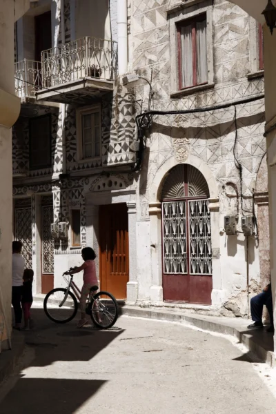 Η αρχιτεκτονική τεχνοτροπία γνωστή στην τοπική διάλεκτο ως ξυστή, γεμίζει ασφυκτικά -ο εφιάλτης ενός ψυχαναγκαστικού- κάθε τοίχο και κάθε λευκή επιφάνεια με μαύρα επαναλαμβανόμενα μοτίβα αφήνοντας μια νότα ενός απροσδιόριστου μοντερνισμού στο μεταίχμιο Ανατολής και Δύσης.