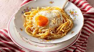 Σερβίρετε τα μακαρόνια σε πιάτα, τοποθετώντας από ένα αυγό σε κάθε πιάτο. Πασπαλίζετε με την υπόλοιπη μυζήθρα και σε