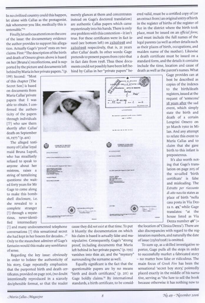 Ο Κέιτζ υποστηρίζει ότι η Κάλλας, παρά την πρόωρη εμμηνόπαυση που φέρεται να είχε από το 1957, να συλλάβει χάρη σε ειδική ορμονική θεραπεία. Ωστόσο, πολλοί αμφισβητούν τη θεωρία του, λέγοντας ότι δεν υπάρχουν ενδείξεις εγκυμοσύνης στα δημόσια εμφανίσεις της εκείνης της εποχής. Παρ’ όλα αυτά, οι αναφορές στο «χαμένο γιο» της Κάλλας συνεχίζουν να εμφανίζονται σε βιογραφίες και άρθρα, τροφοδοτώντας τον μύθο γύρω από τη ζωή της.