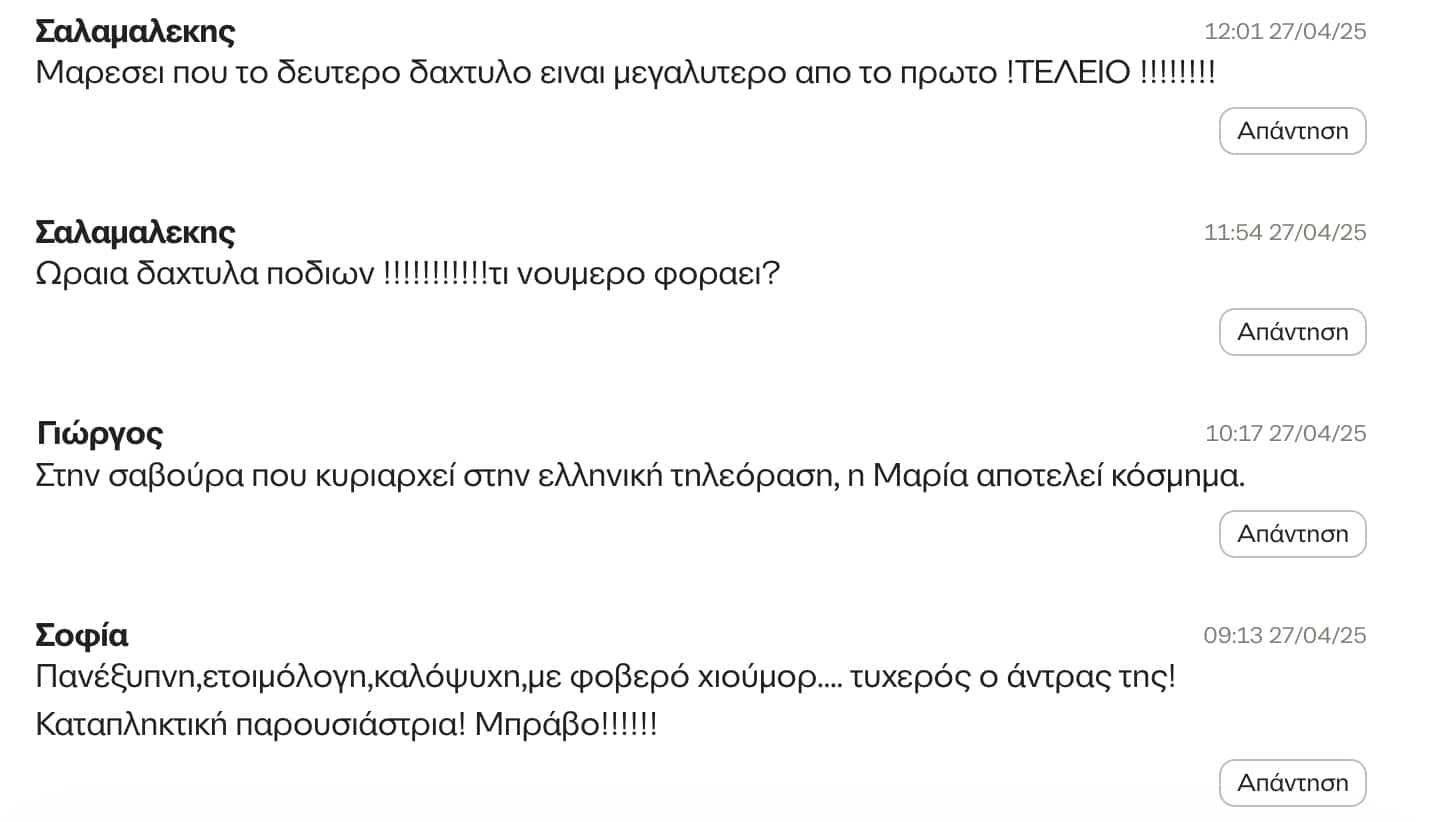 «Έχω μάθει λοιπόν να μην σκάω. Αγαπάω τη δουλειά μου και νιώθω πολύ τυχερή που κάνω αυτό που αγαπάω και από αυτό κερδίζω χρήματα για να ζήσω που είναι πολύ σημαντικό. Όλα όμως είναι απλά. Δεν με αγγίζουν οι τοξικότητες, δεν ασχολούμαι. Τα θεωρώ πολύ χάσιμο χρόνου όλα αυτά» είχε αναφέρει σε πρόσφατη συνέντευξή της, περίπου, στα τέλη Μαρτίου.