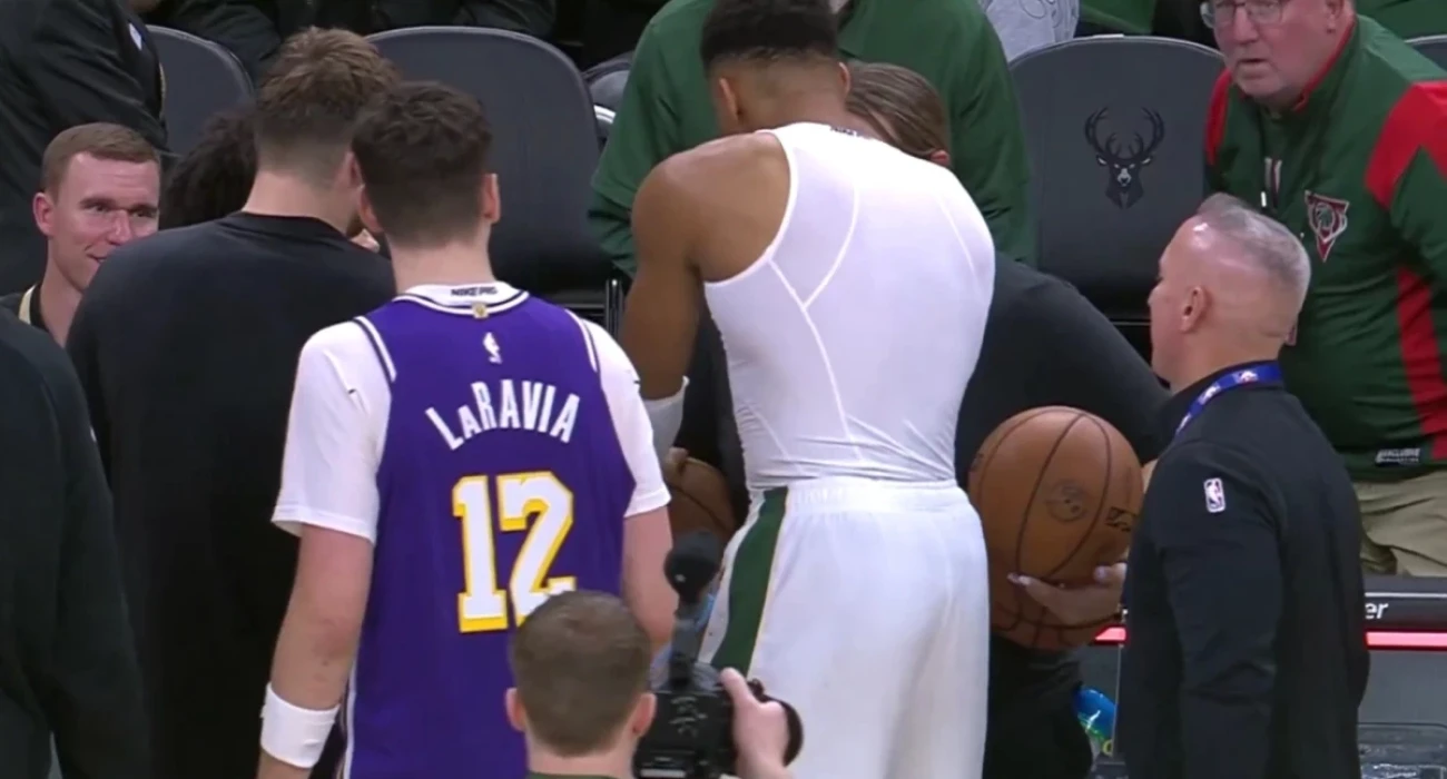Ο Γιάννης Αντετοκούνμπο αντιλήφθηκε άμεσα τη δυσάρεστη στιγμή του rookie. Χωρίς δεύτερη σκέψη, πήγε στους ανθρώπους των Μπακς, πήρε την μπάλα από τα χέρια τους και την παρέδωσε σε μέλος της ομάδας των Λέικερς, για να καταλήξει στον δικαιούχο της, τον Αντού Τιερό.