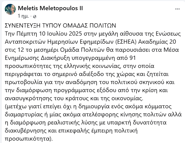 Συγκεκριμένα, την Πέμπτη 10 Ιουλίου 2025, στις 12 το μεσημέρι, στην ΕΣΗΕΑ, η Ομάδα Πολιτών θα παρουσιάσει μια Διακήρυξη υπογεγραμμένη από 91 σημαντικές προσωπικότητες της ελληνικής κοινωνίας. Το κείμενο αυτό περιγράφει το σημερινό «αδιέξοδο» της χώρας και ζητά μια πρωτοβουλία για την αναδόμηση του πολιτικού σκηνικού, με στόχο τη διαμόρφωση ενός ρεαλιστικού προγράμματος για την έξοδο από την κρίση και την ανασυγκρότηση του κράτους και της οικονομίας. Όπως αναφέρεται χαρακτηριστικά, ο σκοπός δεν είναι η δημιουργία ενός ακόμα κόμματος διαμαρτυρίας, αλλά μιας λύσης με δυνατότητα διακυβέρνησης και επικεφαλής μια έμπειρη πολιτική προσωπικότητα. Την παρουσίαση της πρωτοβουλίας έχουν αναλάβει ο καθηγητής Γιάννης Μάζης και ο Μελέτης Μελετόπουλος, με τον Μάζη να έχει επικρίνει δριμύτατα σε πρόσφατη συνέντευξή του την κυβέρνηση Μητσοτάκη.