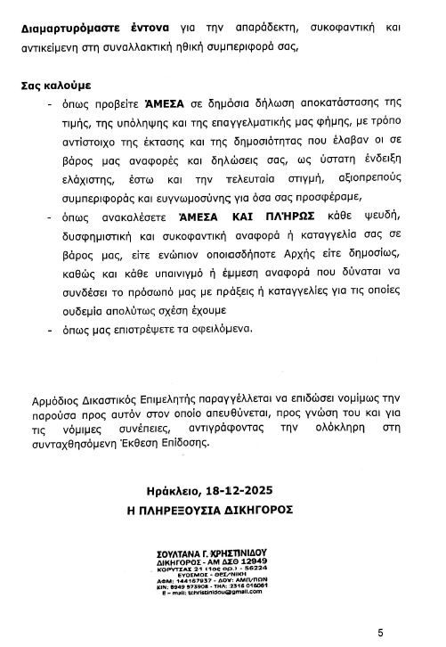 Η κόντρα πλέον παίρνει διαστάσεις δημόσιας αντιπαράθεσης. Ο επιχειρηματίας, μέσω των νομικών του εκπροσώπων, καλεί τον τραγουδιστή να προχωρήσει σε άμεση δήλωση αποκατάστασης της φήμης του. Το εξώδικο στον Γιώργο Μαζωνάκη καταλήγει με την αξίωση να επιστραφούν όλα τα οφειλόμενα ποσά και να ανακληθεί κάθε υπαινιγμός που θίγει την επαγγελματική ακεραιότητα του επιχειρηματικού σχήματος.
