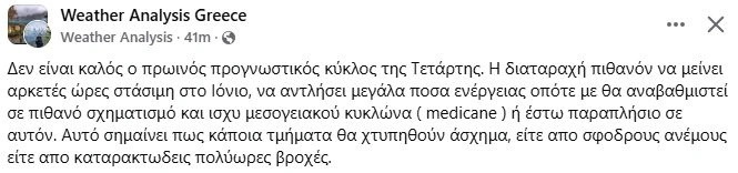 Παρόλο που τα προγνωστικά δεδομένα εξελίσσονται συνεχώς, τα τωρινά στοιχεία δείχνουν ότι η κακοκαιρία είναι πολύ έντονη. Ο διευθυντής της ΕΜΥ, Θοδωρής Κολυδάς, προειδοποίησε για πολλές βροχές το Σαββατοκύριακο. Ενώ ο μετεωρολόγος Γιώργος Τσατραφύλλιας ανέφερε ότι πέρα από τις καταιγίδες, αναμένονται και χιονοπτώσεις σε χιονοδρομικά κέντρα και σε πόλεις της Μακεδονίας. Με πτώση της θερμοκρασίας κατά 4 έως 6 βαθμούς.