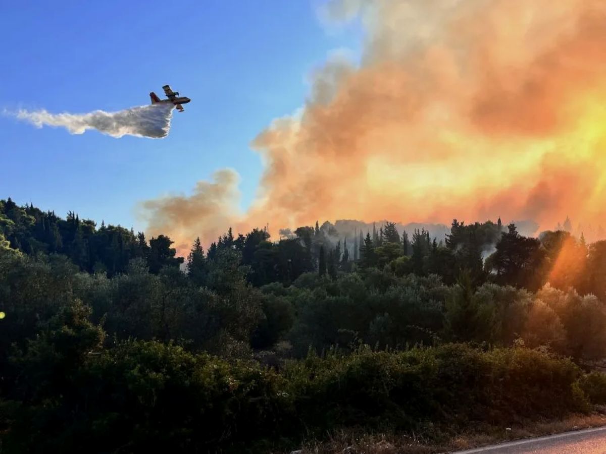 Η μάχη με τις φλόγες γίνεται και από αέρος, με τη συνδρομή δύο αεροσκαφών και τριών ελικοπτέρων.