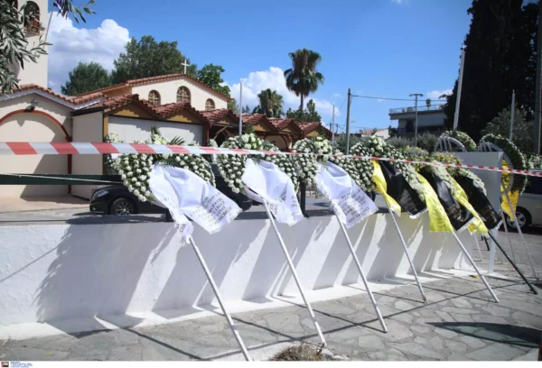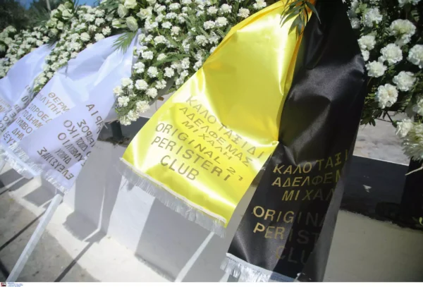 Κόσμος με κίτρινα τριαντάφυλλα στα χέρια λέει το τελευταίο αντίο στον Μιχάλη Κατσουρή στον Ιερό Ναό Αγίου Κωνσταντίνου, στην Ελευσίνα όπου ζούσε. Ο 29χρονος φίλος της ΑΕΚ δολοφονήθηκε στη διάρκεια της καταδρομικής επίθεσης των χούλιγκαν της Ντινάμο Κιέβου, το βράδυ της Δευτέρας (07.08.2023) στη Νέα Φιλαδέλφεια.
