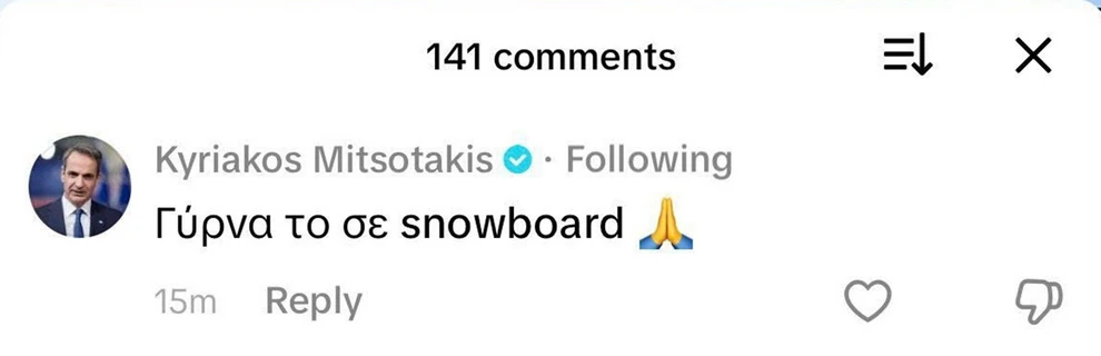 Η μεγάλη έκπληξη ήρθε στα σχόλια της ανάρτησης. Ο επίσημος λογαριασμός του Κυριάκου Μητσοτάκη εμφανίστηκε κάτω από το βίντεο, με τον Πρωθυπουργό να «σηκώνει το γάντι» του τρολαρίσματος. Με διάθεση αυτοσαρκασμού, έγραψε: «Γύρνα το σε snowboard», προτείνοντας στον άτυχο σκιέρ να αλλάξει άθλημα για να δει… άσπρη μέρα!