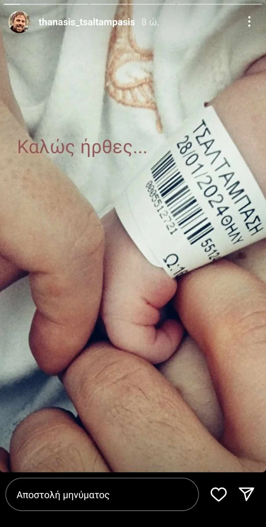 Ο ίδιος ο Θανάσης Τσαλταμπάσης ανέβασε την πρώτη φωτογραφία της κόρης του αλλά δέχθηκε και επί σκηνής τις ευχές για τον ερχομό του πρώτο του παιδιού.