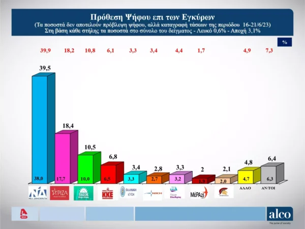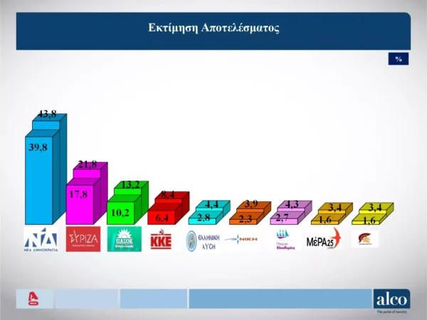 Η Νέα Δημοκρατία διατηρεί μεγάλο προβάδισμα 21,1 μονάδων έναντι του ΣΥΡΙΖΑ σύμφωνα με τη δημοσκόπηση της Alco για τον Alpha.
