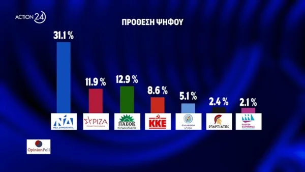 Συγκεκριμένα, στην πρόθεση ψήφου της έρευνας, η Νέα Δημοκρατία βρίσκεται στο 31,1% και το ΠΑΣΟΚ στο 12,9%. Ακολουθεί ο ΣΥΡΙΖΑ στο 11,9%, το ΚΚΕ στο 8,6% και η Ελληνική Λύση στο 5,1%. Η Νίκη βρίσκεται στο 3,2%.