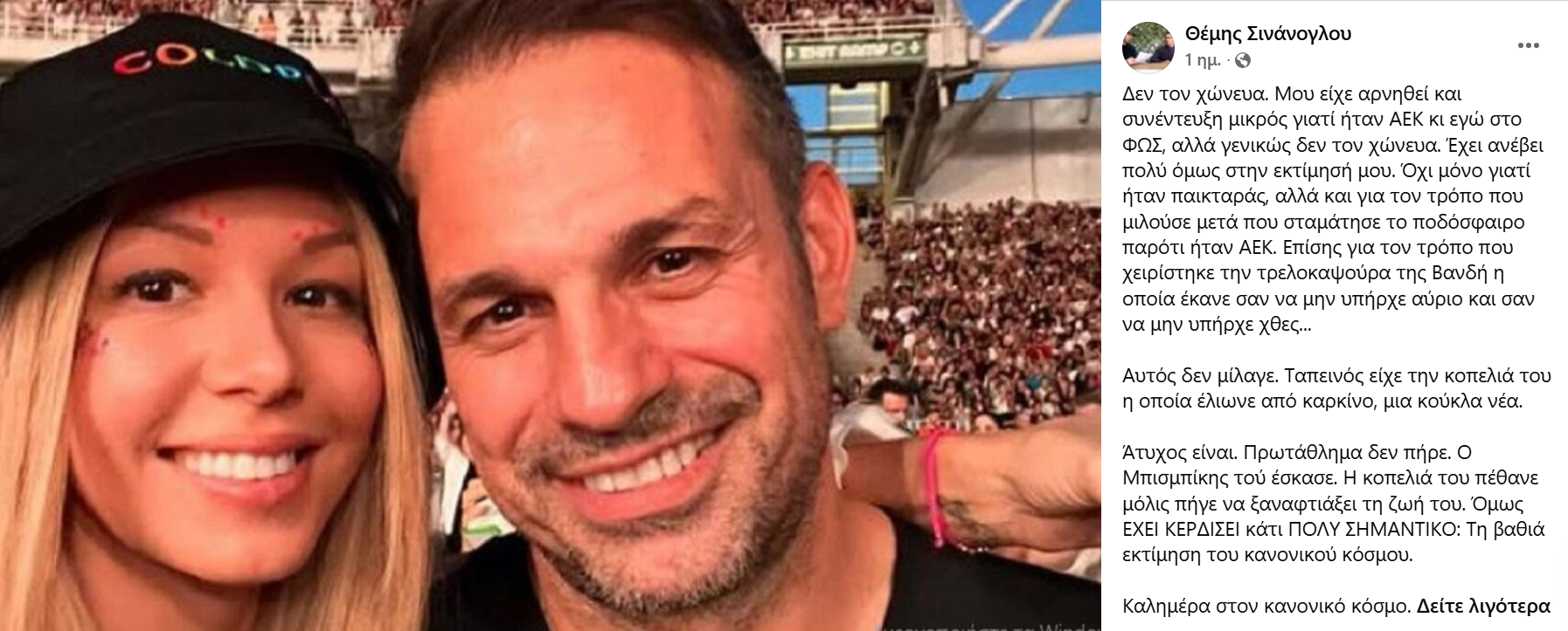 Πιο συγκεκριμένα, ο Θέμης Σινάνογλου έγραψε: «Δεν τον χώνευα. Μου είχε αρνηθεί και συνέντευξη μικρός γιατί ήταν ΑΕΚ κι εγώ στο ΦΩΣ, αλλά γενικώς δεν τον χώνευα. Έχει ανέβει πολύ όμως στην εκτίμησή μου. Όχι μόνο γιατί ήταν παικταράς, αλλά και για τον τρόπο που μιλούσε μετά που σταμάτησε το ποδόσφαιρο παρότι ήταν ΑΕΚ.