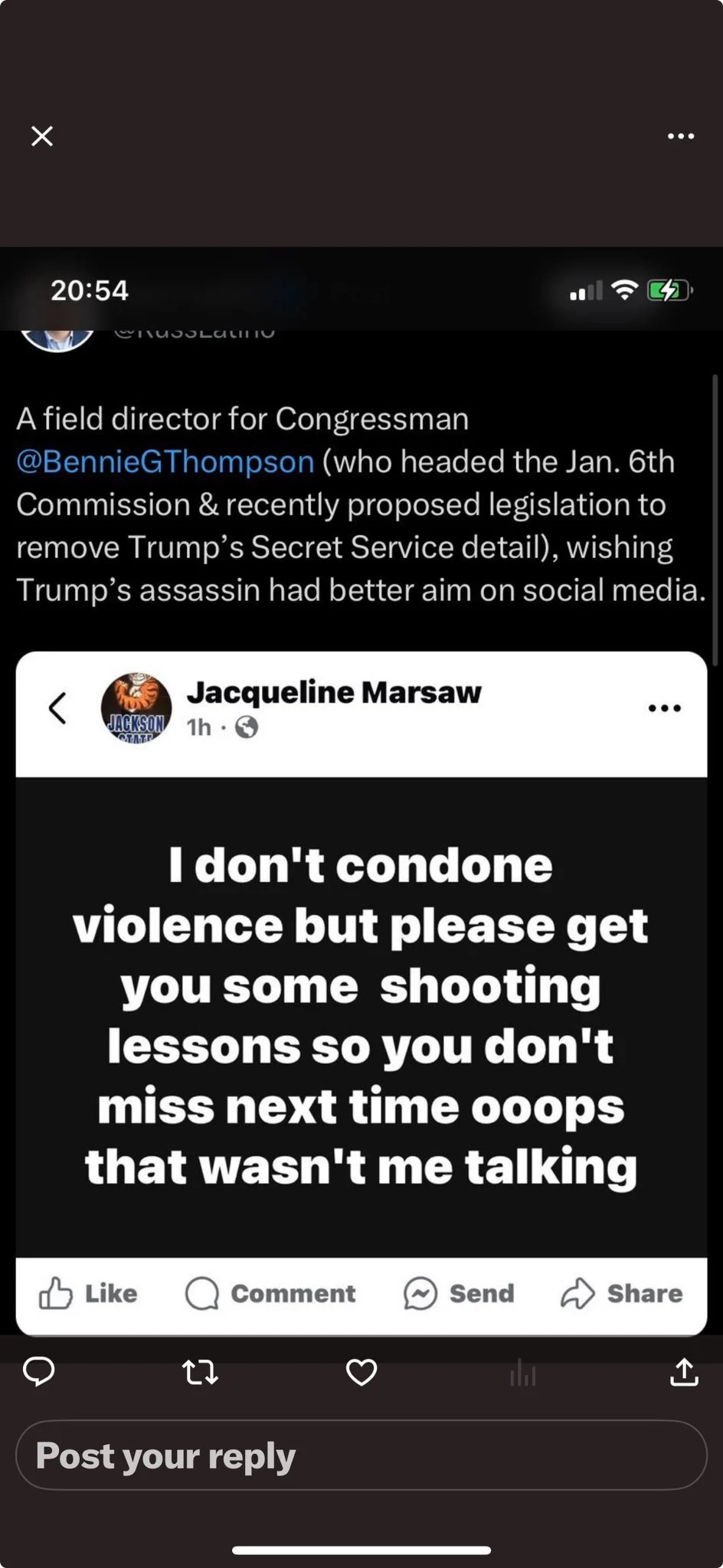 Η διευθύντρια του βουλευτή, Ζακλίν Μαρσώ, έκανε μια ανάρτηση που προκάλεσε θύελλα αρνητικών σχολίων. Πολλοί πλέον συνδέουν το αφεντικό της με την απόπειρα δολοφονίας του Τραμπ.