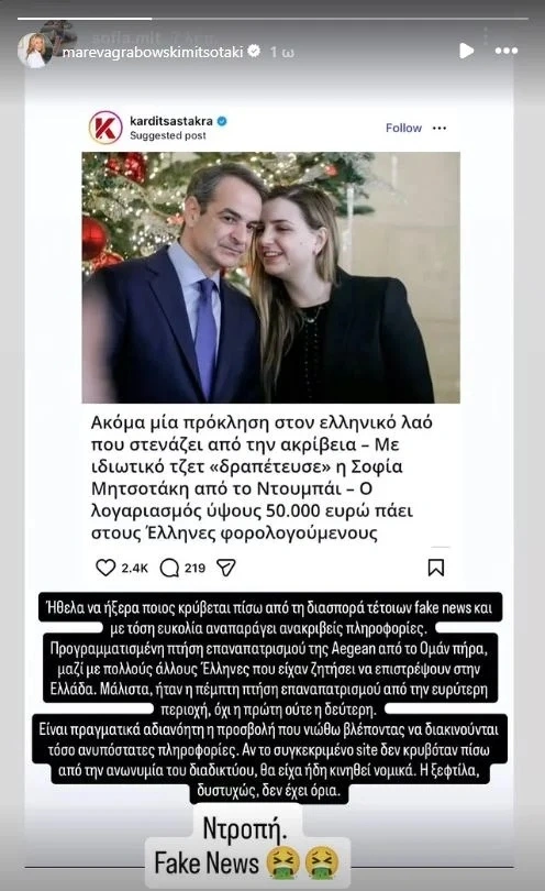 «Ντροπή, fake news», έγραψε η κ. Μητσοτάκη, εκφράζοντας την αγανάκτησή της για τη στοχοποίηση του παιδιού της.