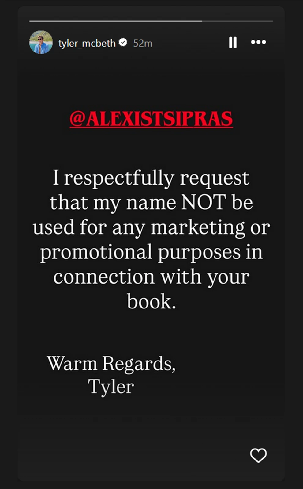 Η αναφορά αυτή προκάλεσε άμεση αντίδραση από τον Τάιλερ Μακμπέθ, ο οποίος μέσα από ένα Instagram Story ζήτησε να μην χρησιμοποιείται το όνομά του για προώθηση ή μάρκετινγκ σε σχέση με το βιβλίο. Ο Μακμπέθ ταγκάρισε μάλιστα και τον ίδιο τον Αλέξη Τσίπρα, εκφράζοντας έτσι την αποδοκιμασία του για τη δημόσια χρήση των προσωπικών του στοιχείων.