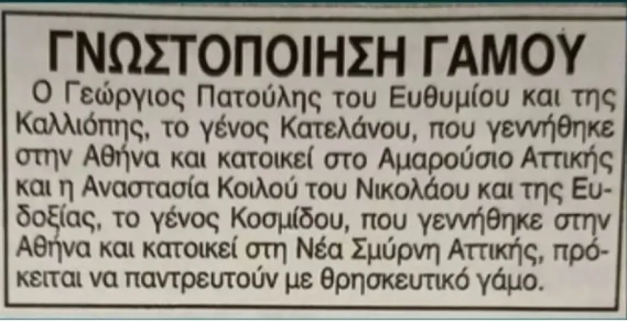 Σύμφωνα με την εκπομπή «Buongiorno» που προβλήθηκε την Παρασκευή 1 Νοεμβρίου, το ζευγάρι δημοσίευσε την αναγγελία του γάμου του. Στην τοπική εφημερίδα της Κεφαλονιάς. Η Νάνσυ Κοιλού συνόδευσε διακριτικά τον Γιώργο Πατούλη, ο οποίος έκανε δηλώσεις στις τηλεοπτικές κάμερες σχετικά με τον επικείμενο γάμο τους.