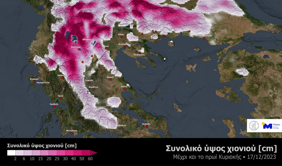 Στον χάρτη 3 δίνεται το εκτιμώμενο αθροιστικό ύψος χιονιού στη χώρα μέχρι τις πρωινές ώρες της Κυριακής 17/12.