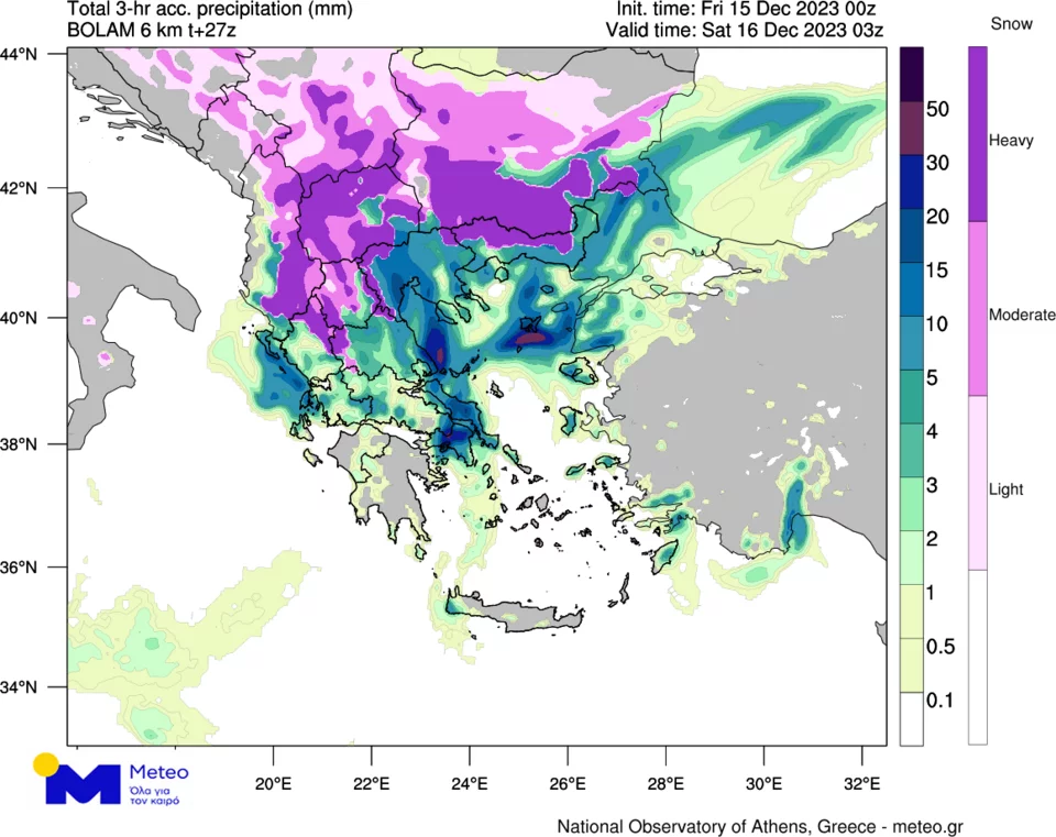 Από την πλευρά του, το Meteo αναφέρει σήμερα, Σάββατο (16/12), έντονη κακοκαιρία θα επικρατήσει στις περισσότερες περιοχές της χώρας, με τοπικά ισχυρές βροχές και καταιγίδες.