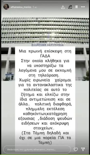 Στην ανάρτησή του, ο Μάριος Αθανασίου έγραψε: «Μια πρωινή επίσκεψη στη ΓΑΔΑ, στην οποία κλήθηκα για να υποστηρίξω τα λεγόμενά μου σε εκπομπή στην τηλεόραση. Χωρίς ειρωνεία, χαίρομαι για τα αντανακλαστικά της πολιτείας σε αυτό ζήτημα και ελπίζω στην ίδια αντιμετώπιση και σε άλλα…».