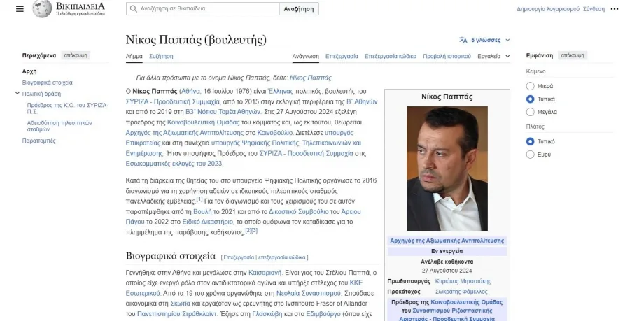 Ο Νίκος Παππάς «νέος αρχηγός» του ΣΥΡΙΖΑ… Μια εντυπωσιακή και ταυτόχρονα αμήχανη στιγμή καταγράφηκε στη Wikipedia, όπου ο Νίκος Παππάς εμφανίστηκε ως ο νέος Αρχηγός της Αξιωματικής Αντιπολίτευσης στην Ελλάδα. Σύμφωνα με τη Wikipedia, ο Νίκος Παππάς ανέλαβε αυτά τα καθήκοντα στις 27 Αυγούστου, κάτι που προκάλεσε αίσθηση, δεδομένου ότι η συγκεκριμένη πληροφορία είναι ανακριβής.