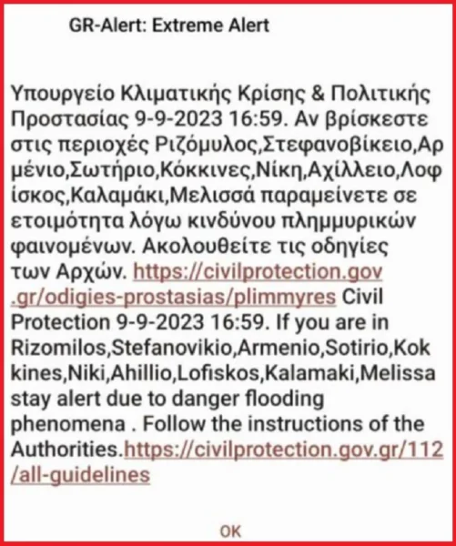 Νωρίτερα, το απόγευμα του Σαββάτου, εστάλη μήνυμα από το 112 στη Μαγνησία καλώντας τους κατοίκους στα χωριά Ριζόμυλος, Στεφανοβίκειο, Αρμένιο, Σωτήριο, Κόκκινες, Νίκη, Μέλισσα, Αχίλλειο, Λοφίσκος, Καλαμάκι να παραμένουν σε ετοιμότητα εκκένωσης λόγω πλημμυρικών φαινομένων.
