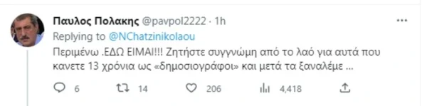 Λίγο μετά τα μεσάνυχτα, ο Πολάκης έκανε την εμφάνισή του και απάντησε στον Χατζηνικολάου, καλώντας τον να ζητήσει συγγνώμη από τον λαό. «Περιμένω. ΕΔΩ ΕΙΜΑΙ!!! Ζητήστε συγγνώμη από το λαό για αυτά που κανετε 13 χρόνια ως «δημοσιογράφοι» και μετά τα ξαναλέμε…» έγραψε ο κ. Πολάκης.