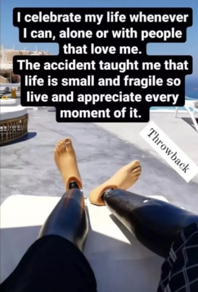 «Γιορτάζω τη ζωή μου οποτεδήποτε μπορώ μόνος μου ή με ανθρώπους που με αγαπούν. Το ατύχημα με δίδαξε ότι η ζωή είναι μικρή και εύθραυστη για αυτό ζήσε και εκτίμησε την κάθε στιγμή της!»