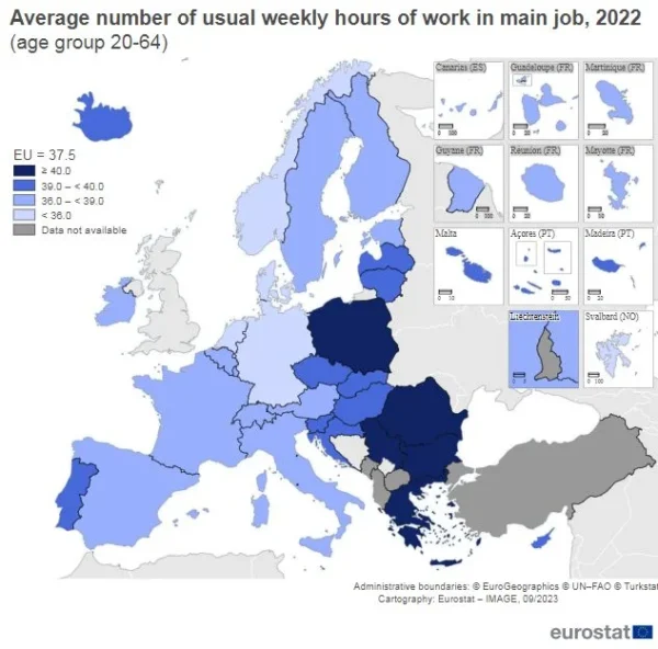 Σύμφωνα με τα επίσημα στοιχεία, ο εργαζόμενος στην Ελλάδα εργάζεται 41 ώρες την εβδομάδα. Ακολουθούν οι εργαζόμενοι στην Πολωνία με 40,4 ώρες και οι εργαζόμενοι σε Βουλγαρία και Ρουμανία με 40,2 ώρες.