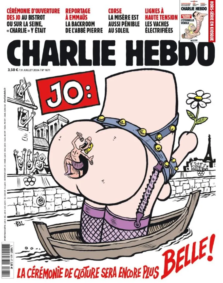 Ολυμπιακοί Αγώνες: Το καυστικό εξώφυλλο του Charlie Hebdo για την τελετή έναρξης – Το γνωστό γαλλικό σατιρικό περιοδικό Charlie Hebdo προκάλεσε αντιδράσεις με το τελευταίο εξώφυλλό του, το οποίο σχολιάζει την επικείμενη τελετή έναρξης των Ολυμπιακών Αγώνων στο Παρίσι. Το σκίτσο, το οποίο φιλοξενείται στο εξώφυλλο, απεικονίζει έναν παράδοξο χαρακτήρα… Ένα ακέφαλο σώμα με γυμνά οπίσθια, καλτσοδέτες και ένα ανδρικό μόριο στολισμένο με λουλούδια, που παρελαύνει κατά μήκος του ποταμού Σηκουάνα.