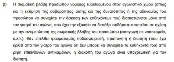 Η σωματική βλάβη προσώπου νομίμως ευρισκομένου στον αγωνιστικό χώρο (όπως και η εκτίμηση της σοβαρότητας αυτής και της δυνατότητας ή της αδυναμίας του προσώπου να συνεχίσει την άσκηση των καθηκόντων του) διαπιστώνεται μόνο από τον γιατρό του αγώνα, που έχει την εξουσία να διατάξει οτιδήποτς απαιτείται σε σχέση με την αντιμετώπιση της σωματικής βλάβης του προσώπου (εισαγωγή σε νοσοκομείο κλπ). Εάν επέλθει τραυματισμός ποδοσφαιριστή, προπονητή ή διαιτητή (που έχει κριθεί από τον γιατρό του αγώνα ότι δεν μπορεί να συνεχίσει τα καθήκοντά του) από ρίψη επικίνδυνων αντικειμένων, η διακοπή του αγώνα είναι υποχρεωτική για τον διαιτητή.