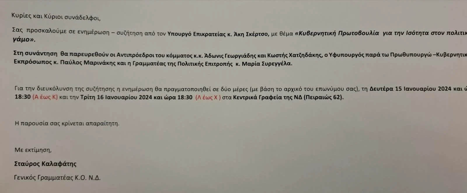 Ο Νικήτας Κακλαμάνης πάντως ήταν ξεκάθαρος αναφερόμενος στο «προσκλητήριο» για το διήμερο… επιμορφωτικό σεμινάριο με μπόλικο «μασάζ», που απηύθυνε στους «γαλάζιους» βουλευτές ο Γραμματέας της ΚΟ Σταύρος Καλαφάτης, με θέμα «Κυβερνητική Πρωτοβουλία για την Ισότητα στον πολιτικό γάμο», υπό τον Άκη Σκέρτσο και… παραστάτες τους Άδωνι Γεωργιάδη, Κωστή Χατζηδάκη, Παύλο Μαρινάκη και Μαρία Συρεγγέλα.
