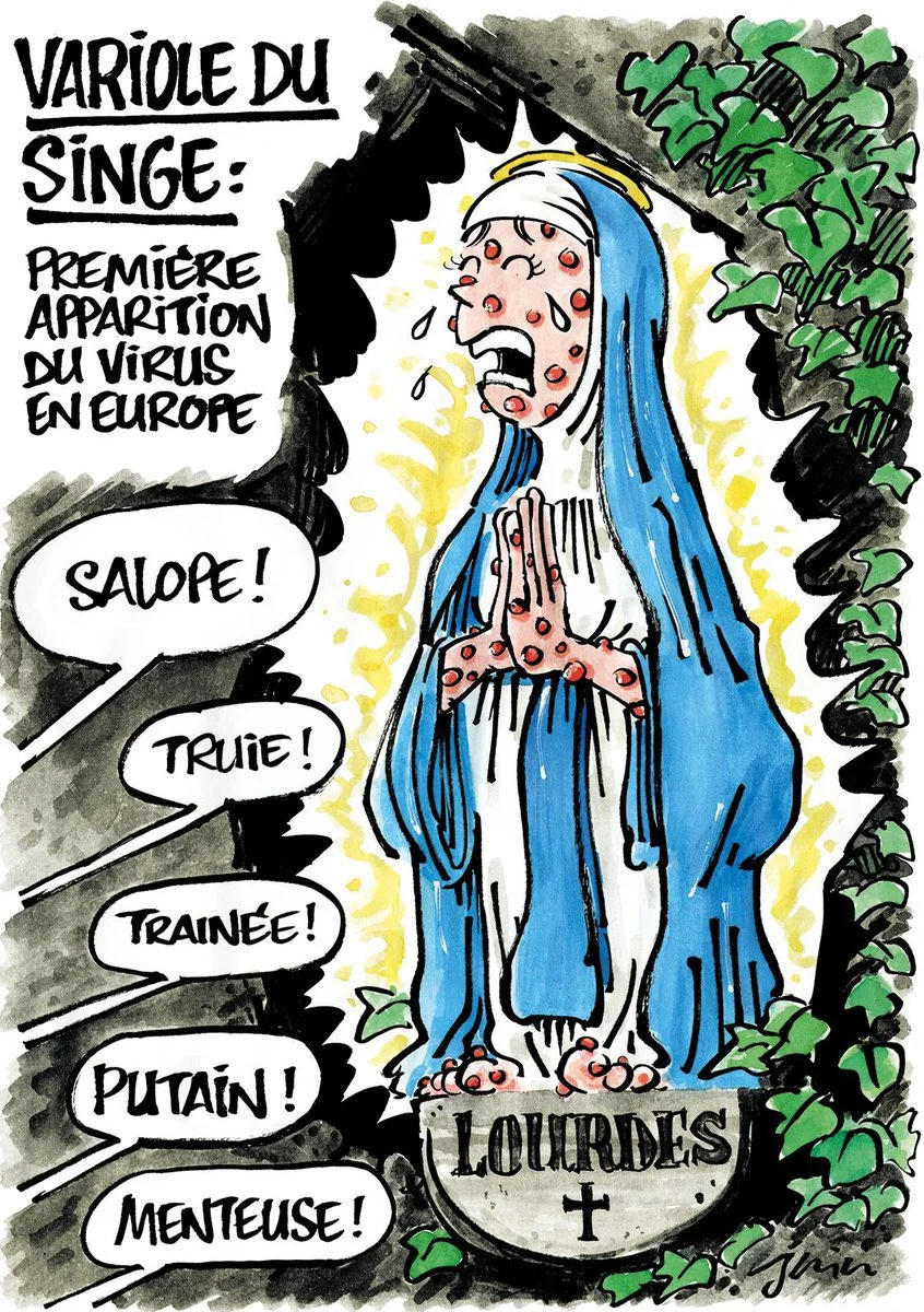 Η καρικατούρα, δημιουργία του Πιερίκ Ζουέν, απεικονίζει την Παναγία με συμπτώματα της ευλογιάς των πιθήκων, με τον τίτλο «Ευλογιά των πιθήκων: πρώτη εμφάνιση του ιού στην Ευρώπη». Στη γελοιογραφία, μέλη ενός αόρατου κοινού την προσβάλλουν, με τη λέξη «ψεύτρα» να είναι η πιο ήπια από τις ύβρεις.