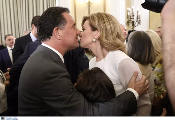 Από τα πλάνα δεν θα μπορούσε να λείπει ο Άδωνις Γεωργιάδης, νέος υπουργός Εργασίας. Τον οποίο ο φακός «έπιασε» να δίνει ένα τρυφερό φιλί στη σύζυγό του Ευγενία Μανωλίδου.