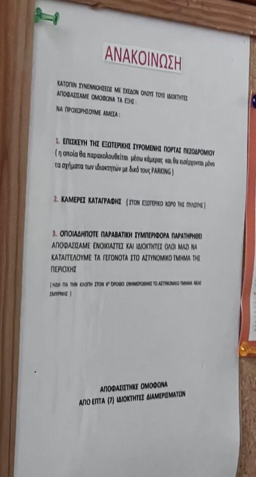 Μάλιστα, οι ένοικοι της πολυκατοικίας έβγαλαν ανακοίνωση για παραβατική συμπεριφορά των νεαρών.