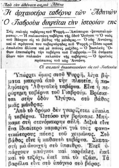 Τον Φεβρουάριο του 1931, η δημοσιογραφική έρευνα της εποχής έφερε στο φως έναν «θησαυρό» που παρέμενε κρυμμένος στα στενάκια της πόλης. Η παλαιότερη ταβέρνα της Αθήνας δεν βρισκόταν σε κάποια κεντρική λεωφόρο, αλλά «τρύπωνε» στην καρδιά του Ψυρρή.