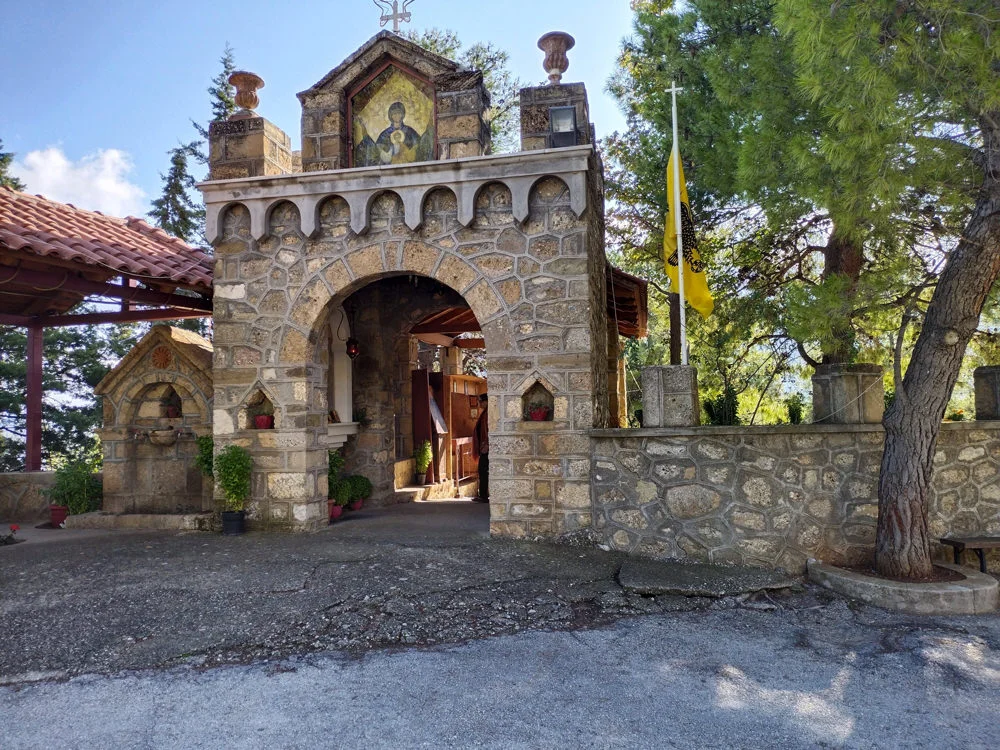 Η επιβλητική είσοδος της Μονής - Διαμόρφωσε έναν χώρο που θυμίζει κρυφό σχολειό και αποτύπωσε λαογραφικές στιγμές της περιοχής.