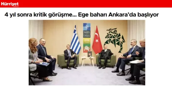 «Συνάντηση στρατιωτικών αντιπροσωπειών με στόχο να ανοίξει μια νέα σελίδα μεταξύ Τουρκίας και Ελλάδας πραγματοποιείται στην Άγκυρα. Καθώς οι αντιπροσωπείες των υπουργείων Άμυνας συναντώνται μετά από τρία χρόνια και εννέα μήνες, στο τραπέζι βρίσκονται μέτρα όπως η αποτροπή της ενόχλησης μεταξύ πολεμικών αεροσκαφών και πλοίων στο Αιγαίο και «κόκκινη γραμμή» μεταξύ των αρχηγείων» αναφέρει η Hurriyet.