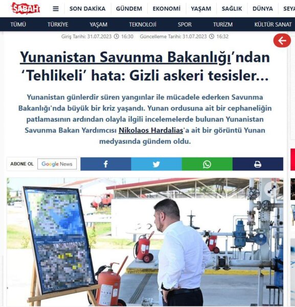«Στην Ελλάδα, η οποία μάχεται με τις πυρκαγιές, το Υπουργείο Άμυνας έχει υποστεί μεγάλη κρίση. Μια εικόνα του Έλληνα υφυπουργού Άμυνας Νικόλαου Χαρδαλιά, ο οποίος ερευνούσε το περιστατικό μετά την έκρηξη ενός οπλοστασίου του ελληνικού στρατού, είναι δημοφιλής στα ελληνικά μέσα ενημέρωσης» αναφέρει μεταξύ άλλων το ahaber, δημοσιεύοντας τις φωτογραφίες πριν και μετά την κάλυψη των απόρρητων πληροφορίων του χάρτη.
